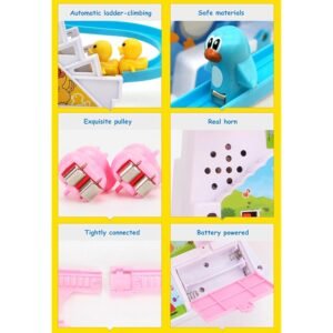 Interactive Duck Action :- 3 cute yellow ducks climb stairs automatically and slide down the colorful track, creating an exciting visual experience.